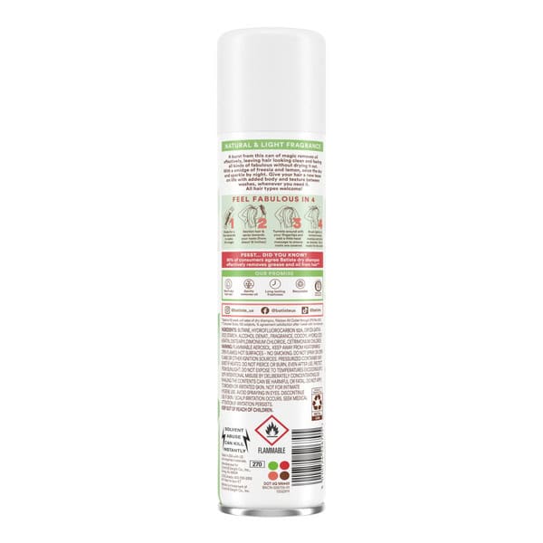 Take your hair from flat to fab with Batiste Bare Dry Shampoo. Our waterless formula targets excess oil and grease at the roots. If you love the benefits of dry shampoo, but don’t love a lot of fragrance in your hair, Batiste Bare is the perfect solution for you. With a subtle clean and light scent, Batiste Bare refreshes your hair without overpowering or competing with your perfume. Batiste Bare low-key scent consists of: mild floral notes, a spritz of citrus, bright leafy greens and a hint of vanilla to remind you that less is more. Batiste Dry Shampoo instantly makes your hair feel clean, fresh, and with added body and texture. Perfect for the girl-on-the-go, use Batiste Dry Shampoo between washes to keep your hair looking fresh and fabulous without the effort. Let’s face it, life gets crazy sometimes and skipping a wash (or two) is inevitable. With Batiste Dry Shampoo, you can be confident your hair looks great no matter what life throws your way.