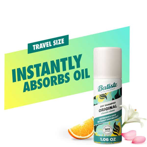 Take your hair from flat to fab with Batiste Original Dry Shampoo. This waterless shampoo targets excess oil and grease at the roots to breathe new life into your hair, leaving you feeling clean between washes. Batiste Original Dry Shampoo is a clean and easy-to-love scent that matches any mood. The Batiste Original has a citrusy and refreshing burst of orange and bergamot, balanced by hints of rose, lily, lavender and powdery musk. Batiste Dry Shampoo instantly makes your hair feel clean and fresh by removing oil, and provides added body and hair texture to give the appearance of fuller hair. Perfect for the girl-on-the-go, using this scented dry shampoo spray helps save time by making styling your hair fast and easy. Using this dry shampoo spray is easy. Shake the shampoo bottle thoroughly, section your hair and spray as much as you want 12 inches from your roots, use your fingertips to massage the Batiste shampoo into your hair and brush or style your hair however you want so you can get going. With Batiste Dry Shampoo, you can be confident your hair looks great no matter what life throws your way. Our mini 1.06 oz bottle is perfect for travel, touch-ups at the gym, the office, or out on the town. Let’s face it, life gets crazy sometimes and skipping a wash (or two) is inevitable. With Batiste Dry Shampoo, you can be confident your hair looks great no matter what life throws your way.
