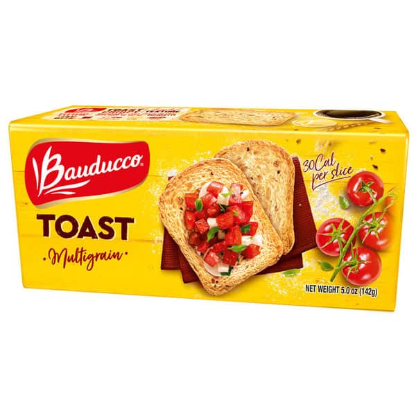 23 cal per slice. Toast crispy. Light texture. Good Anytime: breakfast; light snack or meal; with soup or salad; brusquetta. Try with: fruit jam; ham and cheese; butter; salmon. Partially produced with genetic engineering. www.bauducco.com. Please recycle. No high fructose corn syrup. No artificial colors or preservatives. Made in Brazil.