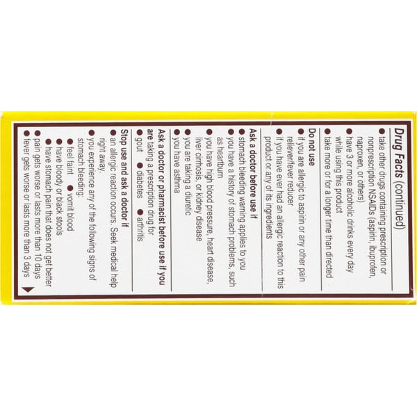 Stop use and ask a doctor if an allergic reaction occurs. Seek medical help right away. You experience any of the following signs of stomach bleeding: feel faint, vomit blood, have bloody or black stools, have stomach pain that does not get better, pain gets worse or lasts more than 10 days, redness or swelling is present, fever lasts more than 3 days, new symptoms occur, ringing in the ears or a loss of hearing occurs if pregnant or breast-feeding, ask a health professional before use. It is especially important not to use aspirin during the last 3 months of pregnancy unless definitely directed to do so by a doctor because it may cause problems in the unborn child or complications during delivery. Keep out of reach of children. In case of overdose, get medical help or contact a poison control center right away. Reye’s syndrome: children and teenagers who have or are recovering from chicken pox or flu-like symptoms should not use this product. When using this product, if changes in behavior with nausea and vomiting occur, consult a doctor because these symptoms could be an early sign of reye’s syndrome, a rare but serious illness. Stomach bleeding warning: this product contains an nsaid, which may cause severe stomach bleeding. The chance is higher if you are age 60 or older, have had stomach ulcers or bleeding problems, take a blood thinning (anticoagulant) or steroid drug, take other drugs containing prescription or nonprescription nsaids (aspirin, ibuprofen, naproxen, or others), have 3 or more alcoholic drinks every day while using this product, take more or for a longer time than directed. Allergy alert: aspirin may cause a severe allergic reaction which may include: hives, facial swelling, asthma (wheezing), shock. Do not use if you are allergic to aspirin or any other pain reliever/fever reducer. Ask a doctor before use if stomach bleeding warning applies to you, you have a history of stomach problems, such as heartburn, you have high blood pressure, heart disease, liver cirrhosis, or kidney disease, you are taking a diuretic, you have asthma. Ask a doctor or pharmacist before use if you are taking a prescription drug for gout, diabetes, arthritis.