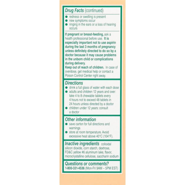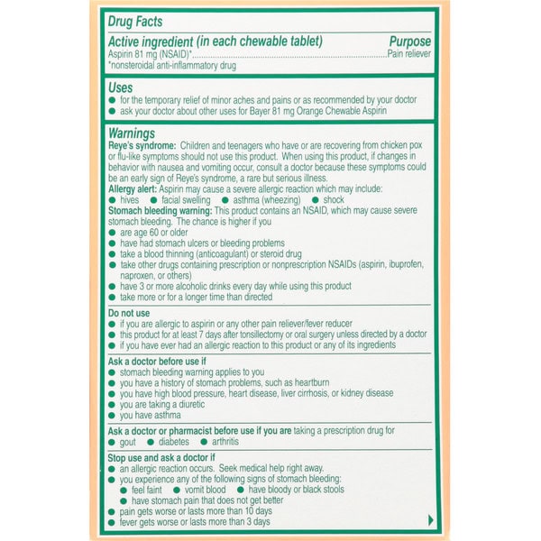 In Each Chewable Tablet: Warnings: Reye’s syndrome: Children and teenagers who have or are recovering from chicken pox or flu-like symptoms should not use this product. When using this product, if changes in behavior with nausea and vomiting occur, consult a doctor because these symptoms could be an early sign of Reye’s syndrome, a rare but serious illness. Allergy alert: Aspirin may cause a severe allergic reaction which may include:: hives; facial swelling; asthma (wheezing); shock. Stomach bleeding warning: This product contains an NSAID, which may cause severe stomach bleeding. The chance is higher if you: are age 60 or older; have had stomach ulcers or bleeding problems; take a blood thinning (anticoagulant) or steroid drug; take other drugs containing prescription or nonprescription NSAIDs (aspirin, ibuprofen, naproxen, or others); have 3 or more alcoholic drinks every day while using this product; take more or for a longer time than directed. Do not use: if you are allergic to aspirin or any other pain reliever/fever reducer; this product for at least 7 days after tonsillectomy or oral surgery unless directed by a doctor; if you have ever had an allergic reaction to this product or any of its ingredients. Ask a doctor before use if: stomach bleeding warning applies to you; you have a history of stomach problems, such as heartburn; you have high blood pressure, heart disease, liver cirrhosis, or kidney disease; you are taking a diuretic; you have asthma. Ask a doctor or pharmacist before use if you are taking a prescription drug for: gout; diabetes; arthritis. Stop use and ask a doctor if: an allergic reaction occurs. Seek medical help right away; you experience any of the following signs of stomach bleeding: feel faint; vomit blood; have bloody or black stools; have stomach pain that does not get better; pain gets worse or lasts more than 10 days; fever gets worse or lasts more than 3 days; redness or swelling is present; new symptoms occur; ringing in the ears or a loss of hearing occurs. If pregnant or breast-feeding, ask a health professional before use. It is especially important not to use aspirin during the last 3 months of pregnancy unless definitely directed to do so by a doctor because it may cause problems in the unborn child or complications during delivery. Keep out of reach of children. In case of overdose, get medical help or contact a Poison Control Center right away. Do not use if printed safety seal bearing Bayer Healthcare under cap is torn or missing.