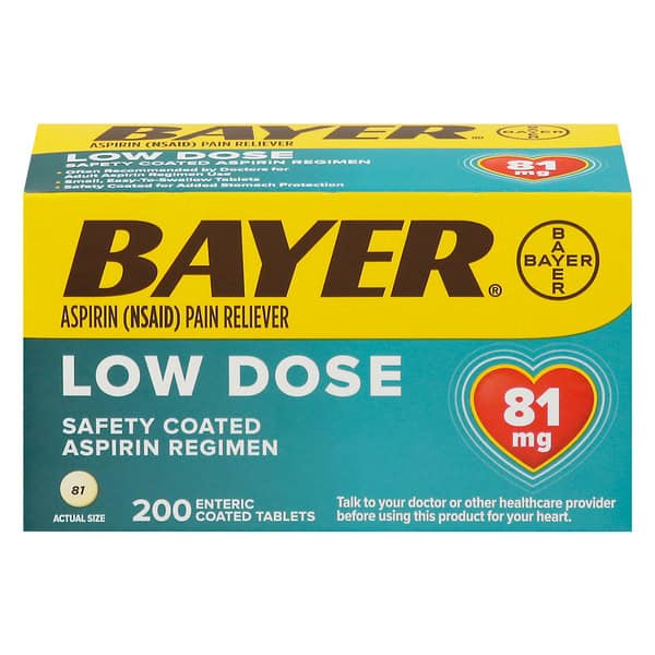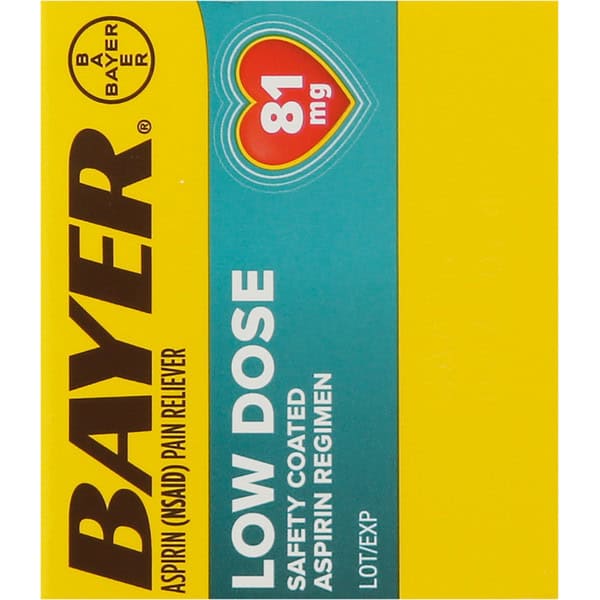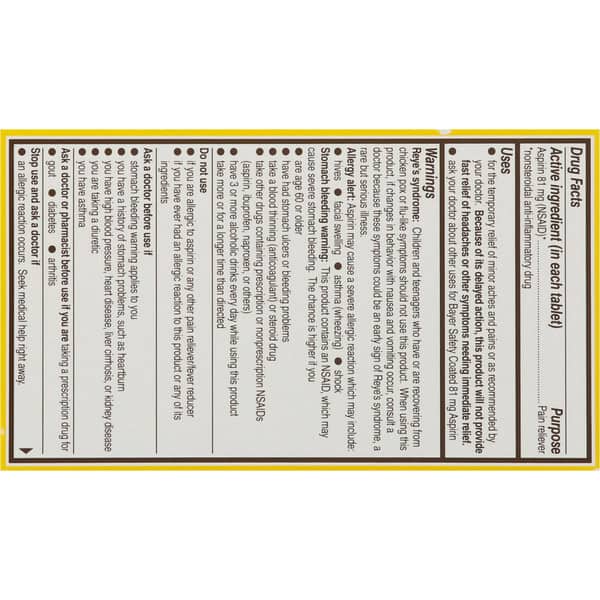 in each tablet Warnings: Reye’s syndrome: Children and teenagers who have or are recovering from chicken pox or flu-like symptoms should not use this product. When using this product, if changes in behavior with nausea and vomiting occur, consult a doctor because these symptoms could be an early sign of Rey’s syndrome, a rare but serious illness. Allergy alert: Aspirin may cause a severe allergic reaction which may include:: hives; facial swelling; asthma (wheezing); shock Stomach bleeding warning: This product contains an NSAID, which may cause severe stomach bleeding. The chance is higher if you: are age 60 or older; have had stomach ulcers or bleeding problems; take a blood thinning (anticoagulant) or steroid drug; take other drugs containing prescription or nonprescription NSAIDs (aspirin, ibuprofen, naproxen, or others); have 3 or more alcoholic drinks every day while using this product; take more or for a longer time than directed. Do not use: If you are allergic to aspirin or any other pain reliever/fever reducer; if you have ever had an allergic reaction to this product or any of its ingredients. Ask a doctor use if: stomach bleeding warnings applies to you; you have a history of stomach problems, such as heartburn; you have high blood pressure. heart disease, liver cirrhosis, or kidney disease; you are taking a diuretic; you have asthma. Ask a doctor or pharmacist before use if you are taking a prescription drug for: gout; diabetes; arthritis Stop use and ask a doctor if: an allergic reaction occurs. Seek medical help right away; you experience any of the following signs of stomach bleeding: feel faint, vomit blood, have bloody or black stools, have stomach pain that does not get better; pain gets worse or lasts more than 10 days; fever gets worse or lasts more than 3 days; redness or swelling is present; new symptoms occur; ringing in the ears or a loss of hearing occurs. If pregnant or breast-feeding, ask a health professional before use. It is especially important not to use aspirin during the last 3 months of pregnancy unless definitely directed to do so by a doctor because it may cause problems in the unborn child or complications during delivery. Keep out of reach of children. In case of overdose, get medical help or contact a Poison Control Center right away. Do not use if printed safety seal bearing Bayer HealthCare under cap is torn or missing.
