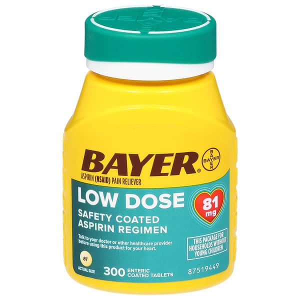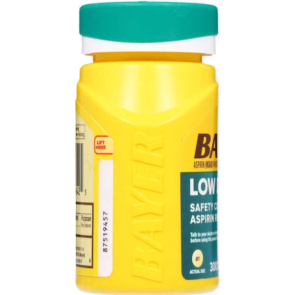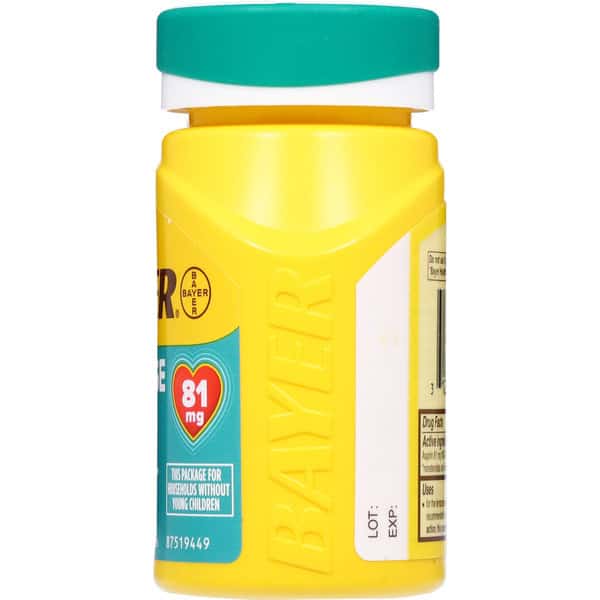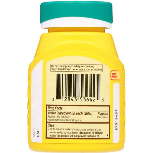 in each tablet Warnings: Reye’s syndrome: Children and teenagers who have or are recovering from chicken pox or flu-like symptoms should not use this product. When using this product, if changes in behavior with nausea and vomiting occur, consult a doctor because these symptoms could be an early sign of Rey’s syndrome, a rare but serious illness. Allergy alert: Aspirin may cause a severe allergic reaction which may include: hives; facial swelling; asthma (wheezing); shock. Stomach bleeding warning: This product contains an NSAID, which may cause severe stomach bleeding. The chance is higher if you: are age 60 or older; have had stomach ulcers or bleeding problems; take a blood thinning (anticoagulant) or steroid drug; take other drugs containing prescription or nonprescription NSAIDs (aspirin, ibuprofen, naproxen, or others); have 3 or more alcoholic drinks every day while using this product; take more or for a longer time than directed. Do not use: If you are allergic to aspirin or any other pain reliever/fever reducer; if you have ever had an allergic reaction to this product or any of its ingredients. Ask a doctor use if: stomach bleeding warnings applies to you; you have a history of stomach problems, such as heartburn; you have high blood pressure. heart disease, liver cirrhosis, or kidney disease; you are taking a diuretic; you have asthma. Ask a doctor or pharmacist before use if you are taking a prescription drug for: gout; diabetes; arthritis Stop use and ask a doctor if: an allergic reaction occurs. Seek medical help right away; you experience any of the following signs of stomach bleeding: feel faint, vomit blood, have bloody or black stools, have stomach pain that does not get better; pain gets worse or lasts more than 10 days; fever gets worse or lasts more than 3 days; redness or swelling is present; new symptoms occur; ringing in the ears or a loss of hearing occurs. If pregnant or breast-feeding, ask a health professional before use. It is especially important not to use aspirin during the last 3 months of pregnancy unless definitely directed to do so by a doctor because it may cause problems in the unborn child or complications during delivery. Keep out of reach of children. In case of overdose, get medical help or contact a Poison Control Center right away. Do not use if printed safety seal bearing Bayer HealthCare under cap is torn or missing. This package for households without young children.