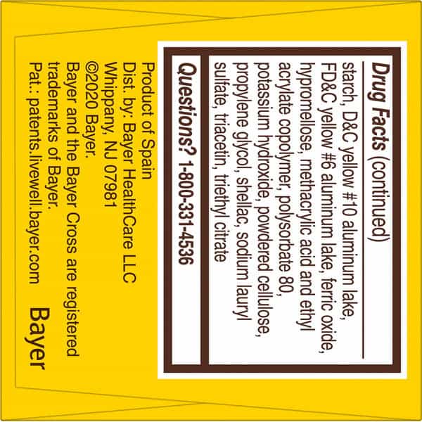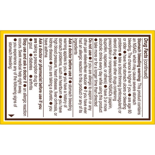 Ask a doctor or pharmacist before use if you are taking a prescription drug for – gout, diabetes, arthritis. Reye’s syndrome: children and teenagers who have or are recovering from chicken pox or flu-like symptoms should not use this product. When using this product, if changes in behavior with nausea and vomiting occur, consult a doctor because these symptoms could be an early sign of reye’s syndrome, a rare but serious illness. Allergy alert: aspirin may cause a severe allergic reaction which may includes: hives, facial swelling, asthma (wheezing), shock. If pregnant or breast-feeding, ask a health professional before use. It is especially important not to use aspirin during the last 3 months of pregnancy unless definitely directed to do so by a doctor because it may cause problems in the unborn child or complications during delivery. Keep out of reach of children. In case of overdose, get medical help or contact a poison control center right away. Stomach bleeding warning: this product contains an nsaid, which may cause severe stomach bleeding. The chance is higher if you are age 60 or older, have had stomach ulcers or bleeding problems, take a blood thinning (anticoagulant) or steroid drug, take other drugs containing prescription or nonprescription nsaids (aspirin, ibuprofen, naproxen, or others), have 3 or more alcoholic drinks every day while using this product, take more or for a longer time than directed. Ask a doctor before use if – stomach bleeding warning applies to you, you have a history of stomach problems, such as heartburn, you have high blood pressure, heart disease, liver cirrhosis, or kidney disease, you are taking a diuretic, you have asthma. Do not use if you are allergic to aspirin or any other pain reliever/fever reducer. Stop use and ask a doctor if – an allergic reaction occurs. Seek medical help right away. You experience any of the following signs of stomach bleeding: feel faint, vomit blood, have bloody or black stools, have stomach pain that does not get better, pain gets worse or lasts more than 10 days, redness or swelling is present, new symptoms occur, ringing in the ears or a loss of hearing occurs.