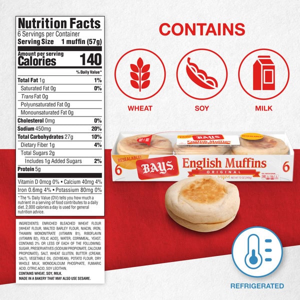 Bays Original English Muffins come pre-sliced and are baked from the original Bays family recipe. They’re perfect paired with butter, as a breakfast sandwich, or a tasty snack any time of day.