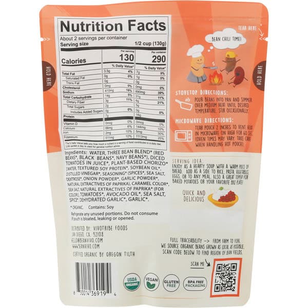 Water, Three Bean Blend* (red Beans*, Black Beans*, Navy Beans*), Diced Tomatoes In Juice*, Plant-based Chorizo* [water, Textured Soy Protein*, Soybean Oil*, Distilled Vinegar*, Seasoning* (spices*, Sea Salt, Dextrose*, Onion Powder*, Garlic Powder*, Natural Extractives Of Paprika), Caramel Color*, Sea Salt, Natural Extractives Of Paprika* (for Color)], Tomatoes*, Avocado Oil*, Sea Salt, Spice*, Dehydrated Garlic*, Garlic*, * Organic