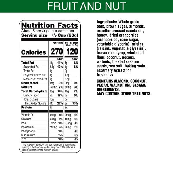 Whole Grain Oats, Honey, Almonds, Expeller Pressed Canola Oil, Coconut, Raisins (raisins, Glycerin), Dried Cranberries (cranberries, Cane Sugar, Vegetable Glycerin), Oat Bran, Maple Syrup, Pecans, Walnuts, Whole Oat Flour, Ground Flax Seeds, Toasted Sesame Seeds