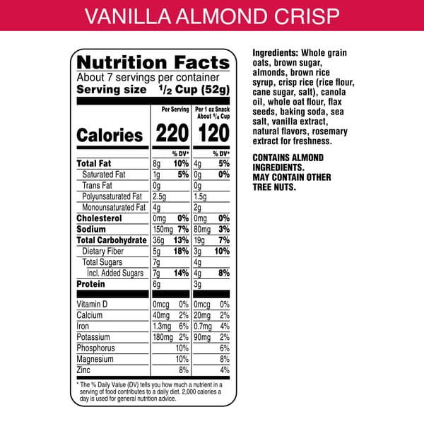 Whole Grain Oats, Brown Rice Syrup, Almonds, Dried Cane Syrup, Whole Grain Crisp Rice (whole Grain Rice, Barley Malt), Oat Bran, Natural Flavor, Ground Flax Seeds.