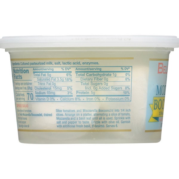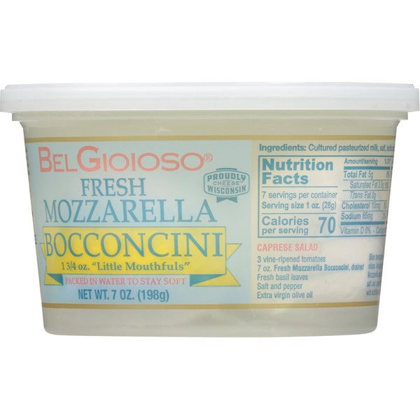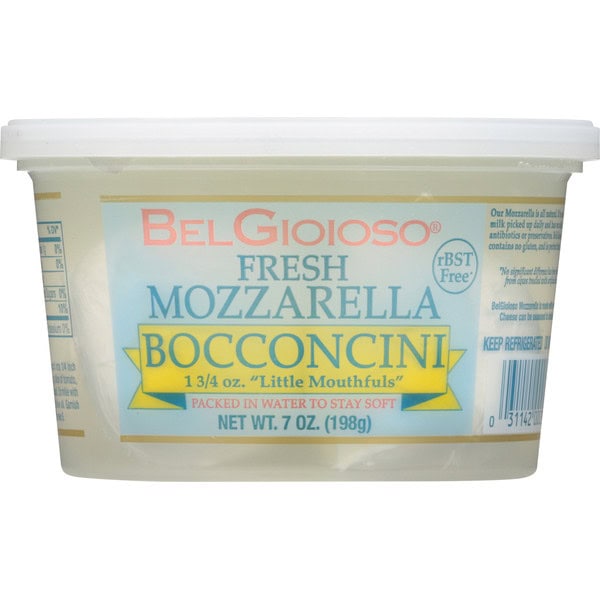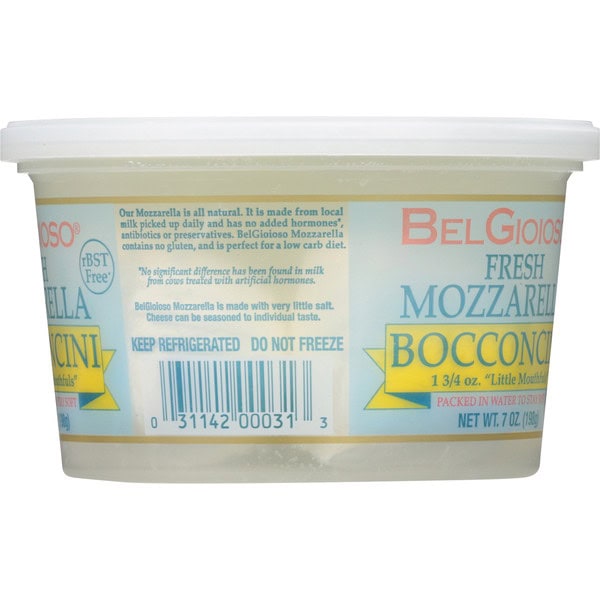 Packed in water to stay soft. rBST free (No significant difference has been found in milk from cows treated with artificial hormones). Classic Italian cheeses. Our Mozzarella is all natural. It is made from local milk picked up daily and has no added hormones (No significant difference has been found in milk from cows treated with artificial hormones), antibiotics or preservatives. BelGioioso Mozzarella contains no gluten, and is perfect for a low carb diet. BelGioioso Mozzarella is made with very little salt. Cheese can be seasoned to individual taste.