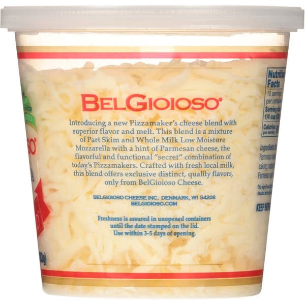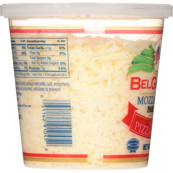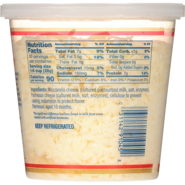 Mozzarella Cheese (cultured Pasteurized Milk, Salt, Enzymes), Parmesan Cheese (cultured Milk, Salt, Enzymes), Cellulose To Prevent Caking, Natamycin To Protect Flavor. Parmesan Aged 10 Months.