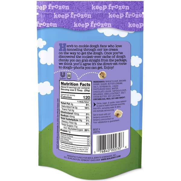 Ben & Jerry’s the dough, the whole dough, and nothing but the dough! This one’s for you, Chocolate Chip Cookie Dough lovers. No more digging for just one more doughy bite – now you can munch on dough chunk after dough chunk to your heart’s content. As much as we love ice cream – and whoa do we love ice cream – for us, it’s always been about the chunks. Euphoria starts and ends with those glorious chunks and swirls. And ever since 1984, fans have been particularly in love with our cookie dough chunks. When an anonymous fan suggested we put gobs of cookie dough in our vanilla ice cream, we couldn’t believe what a great idea it was. We’ve been doing it ever since, and now the cookie dough story has a new chapter: just the dough! No more wrist cramps from digging cookie dough chunks out of your pint, no more hoping for just one more doughy chunk. The future is now, cookie dough lovers! Gobble these up on their own, or sprinkle them over your bowl of ice cream to add even more doughy euphoria. Chocolate Chip Cookie Dough Chunks are made with non-GMO sourced ingredients, Fairtrade Certified cocoa, sugar, and vanilla, and cage-free eggs. Feel good about every doughy bite.