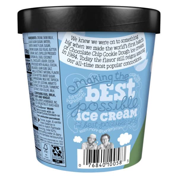 • Ben & Jerry’s Chocolate Chip Cookie Dough ice cream pints are made with Non-GMO ingredients & cage-free eggs