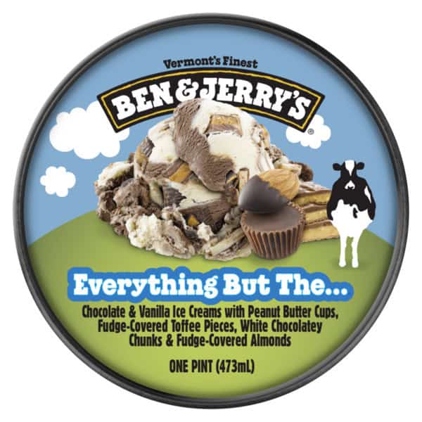 Ben & Jerry’s Everything But The…® Chocolate and Vanilla ice cream pint with peanut butter cups, fudge-covered toffee pieces, white chocolatey chunks, and fudge-covered almonds. We said it: holy cow! It’s a hodgepodge of euphoric delights that literally contains everything but the kitchen sink. Truth be told, we’ve never been good at compromises…or patience…or sound reasoning of any kind, really. We want it all, every bit, every bite, and we want it NOW! That’s just how Ben & Jerry’s Everything But The… was born. Sick and tired of choosing one flavor at a time, we decided to mix a few of our ice cream favorites to create a concoction that delivers all the awesomeness at once. Consider it a direct flight straight to euphoria! No tantrum needed. In fact, we don’t compromise with anything we do, including our commitment to produce the world’s best ice cream and frozen dessert in the most responsible way possible. Like all of our super premium ice cream flavors, Everything But The… is made with non-GMO sourced ingredients, eggs from cage-free hens, and Fairtrade certified cocoa, sugar, and vanilla. Responsibly sourced packaging gets this ice cream pint from our Vermont factory to your freezer. So dig in!