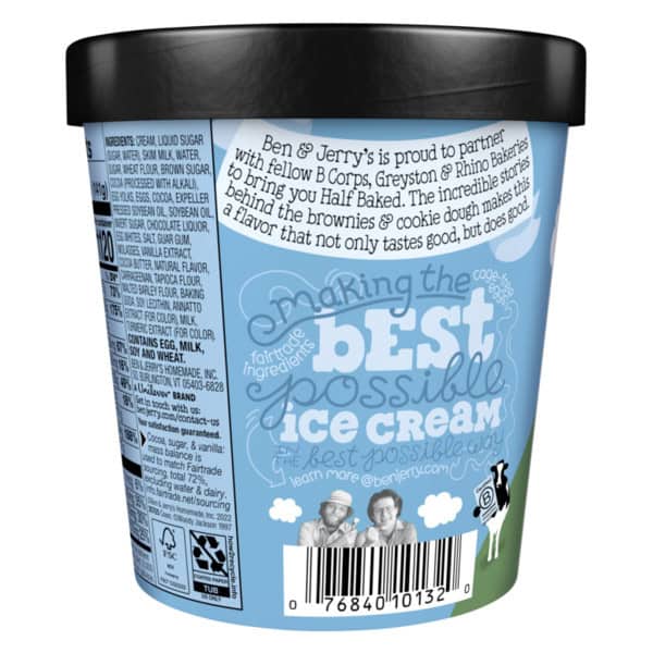 Ben & Jerry’s Half Baked® Chocolate & Vanilla ice cream pint with Chocolate Chip Cookie Dough and Chocolate Fudge Brownies. It’s hard to imagine a better combination. Half Baked® got its name because the cookie dough isn’t baked, but the brownies are—has been a bestselling flavor since we first decided to combine our classic ice cream creations back in 2000. Chocolate Chip Cookie Dough, with big chunks of chocolate chip cookie dough surrounded by vanilla ice cream, was created back in 1984 at our very first Scoop Shop after we received an anonymous fan’s flavor suggestion. It continues as a flavor phenomenon to this very day. Chocolate Fudge Brownie is a fan-favorite chocolate extravaganza, mixing chocolate ice cream with ridiculously delicious Greyston Bakery brownies. It’s been satisfying chocolate lovers since 1991. We know it can be hard to choose between those two legendary flavors. With Half Baked, you don’t have to! We work with Fairtrade certified producers for all the cocoa, sugar, and vanilla in our recipes. Greyston Bakery, one of the largest social enterprises in the US, provides the scrumptious brownies for this and all of our frozen dessert flavors. All our ice cream is made with non-GMO sourced ingredients and cage-free eggs. This ice cream pint, like every pint we make, features responsibly sourced packaging.