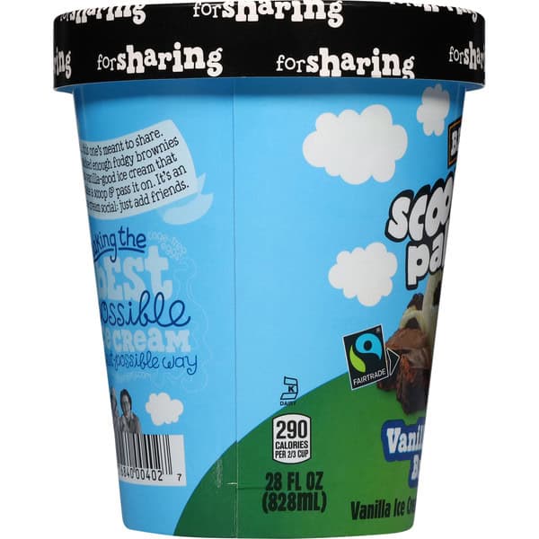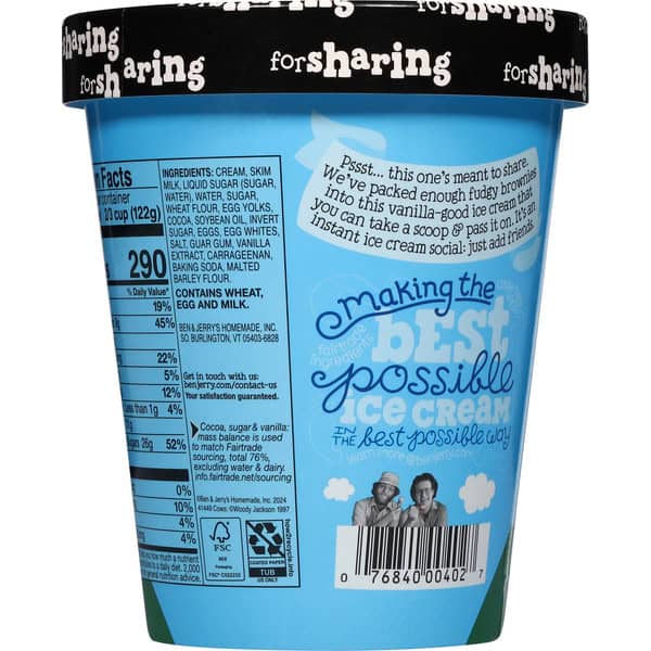 Gather your coolest friends, this one’s meant for sharing! Ben & jerry’s vanilla & fudge brownie features vanilla ice cream with fudge brownie chunks — two iconic flavors that come together for a classically delicious dessert. Brownies and vanilla ice cream are a match made in ice cream heaven! And they’re even better when you share with your nearest and dearest. Movie night with the crew? Crafting with your bestirs? This is the dessert for you! Sweeten up any gathering with vanilla & fudge brownie. You bring the spoons, we’ll bring the yum! And this flavor has something extra special under the lid. The fudge brownies in vanilla & fudge brownie come from Keystone bakery, a social enterprise in Yonkers, NY that supports people who have faced barriers to employment. Through their open hiring program, they hire anybody who comes to them looking for a job — no background checks, interviews, or reference checks. And while people wait for a position to become available, they provide workforce development programs and transitional employment. Now that’s pretty sweet! Ben & Jerry’s Vanilla & fudge brownie frozen dessert is fair trader certified and made with non-GM sourced ingredients. Plus, it comes in responsibly sourced packaging, so you can feel good about overfull bite.