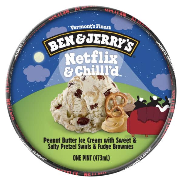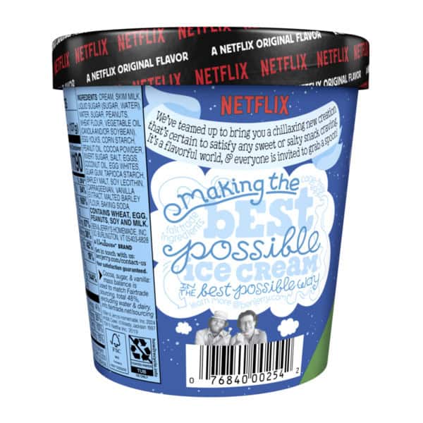 Ben & Jerry’s Peanut butter ice cream pint with sweet & salty pretzel swirls and fudge brownies. We’ve teamed up with Netflix to churn up something extra special! And just like your Netflix queue, there’s something in this pint for everyone. Ready to chillax like never before? When you pop open a pint of Ben & Jerry’s Netflix & Chilll’d ice cream, your euphoric flavor adventure begins. Whether you’re streaming a laugh-out-loud comedy, an edge-of-your-seat drama, or a hey-I-didn’t-know-that documentary, it’s incomplete without a tasty treat and a few of your favorite friends. And with the perfect balance of sweet, salty, and fudgy, Netflix & Chilll’d ice cream is the ideal flavor accompaniment for all your favorite Netflix shows. Follow the sweet and salty pretzel swirls like you follow the plot twists of your favorite drama, or dig out a fudge brownie every time you laugh out loud at that new comedy special. With a spoon and your remote in hand, there’s nothing but euphoria in your future. Go forth and chillax, flavor warrior. Netflix & Chilll’d ice cream is made with non-GMO sourced ingredients, including Fairtrade Certified cocoa, sugar, and vanilla. We use eggs from cage-free hens, and it all comes packaged in responsibly sourced packaging. Now that’s something you can feel wonderful about!