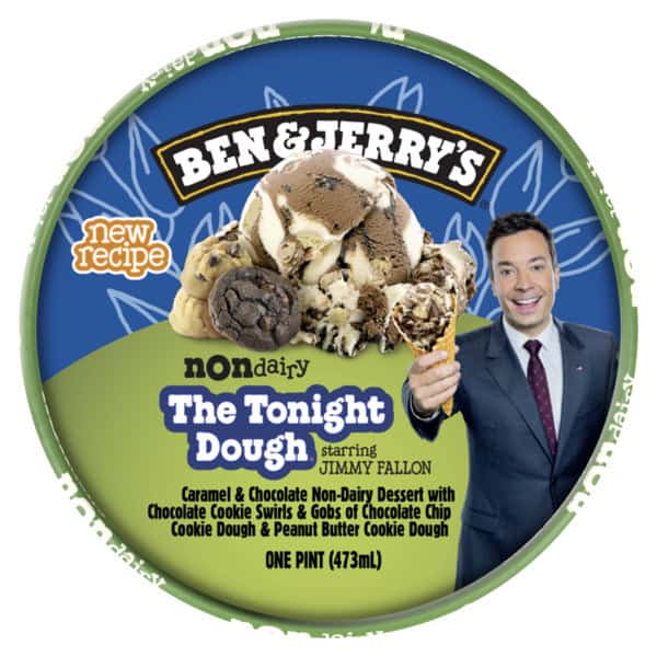 Ben & Jerry’s Caramel and chocolate non-dairy frozen dessert and certified vegan pint with chocolate cookie swirls, gobs of chocolate chip cookie dough and peanut butter cookie dough. Inspired by the show and host that we love staying up late for, this 100% certified vegan version of the dairy original is sure to leave you with a Fallon-sized smile. Dig in to Ben & Jerry’s The Tonight Dough Non-Dairy while you watch The Tonight Show Starring Jimmy Fallon — or whenever you’re craving cookie dough because this pint is chock-full. Fans of the original pint are flipping their lids that our Flavor Gurus have churned up a certified vegan version made with almond milk. Full of all the caramel, chocolate, cookies, and cookie dough you love, The Tonight Dough Non-Dairy is the perfect accompaniment to Jimmy Fallon’s hilarious antics. Whether he’s interviewing this week’s hot personality or reading tweets from his fans, he keeps us laughing from our first scoop to our last. Even sweeter? Proceeds from Ben & Jerry’s The Tonight Dough Non-Dairy go to SeriousFun Children’s Network, a global organization that provides summer camp experiences for children with serious illnesses. Ben & Jerry’s non-dairy is part of a certified vegan diet and is made with non-GMO sourced ingredients, including Fairtrade Certified sugar, cocoa, and vanilla. It comes in responsibly sourced packaging, for a frozen dessert, you can feel good about.