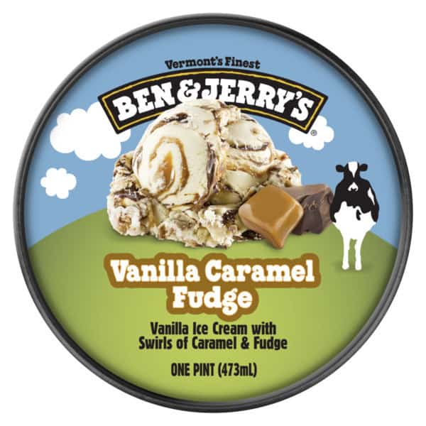 • Ben & Jerry’s Vanilla Caramel Fudge ice cream pint with Vanilla Ice Cream and Swirls of Caramel & Fudge