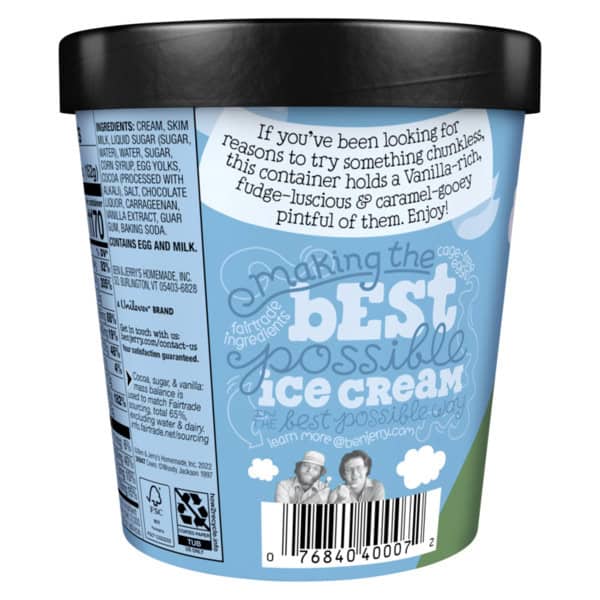 • If you’ve been looking for reasons to try something chunkless & still completely a Ben & Jerry’s ice cream pint, this container holds a Vanilla-rich, fudge-luscious & caramel-gooey pintful of them