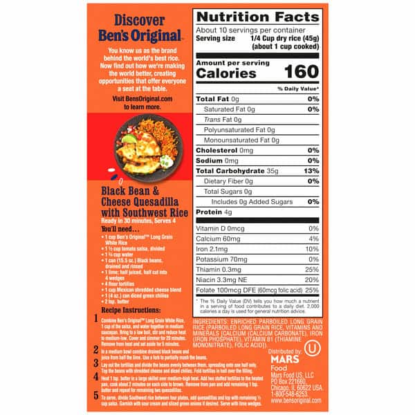 BEN’S ORIGINAL Parboiled Long Grain White Rice serves as an essential source of vitamins in a variety of cooked rice meals, offering a great base for several delicious meals. The classic long grain rice cooks reliably and works well on its own as a delicious side dish or as part of different recipes with meat and vegetables; discover endless potential thanks to its versatile culinary appeal. Whether you use a stovetop or a rice cooker, the preparation couldn’t be any simpler. Place your rice and water into a saucepan, bring the water to a boil, and then let it simmer covered for about 20 minutes after reducing the heat to Medium or Medium-Low. Once done, simply fluff your freshly cooked rice with a fork and serve your family a yummy, nutritious meal. For firmer or softer rice, adjust the cooking time and water amount as necessary. Spice things up come lunchtime by preparing this enriched rice with black beans, diced green chilies and Mexican shredded cheese blend. For interesting parboiled rice side dish recipes that you can always enjoy with your loved ones, consider chicken fried rice. BEN’S ORIGINAL Rice is made with no artificial flavors, colors or preservatives — serve delicious long grain rice with peace of mind. BEN’S ORIGINAL is dedicated to creating meals and experiences that offer everyone a seat at the table.