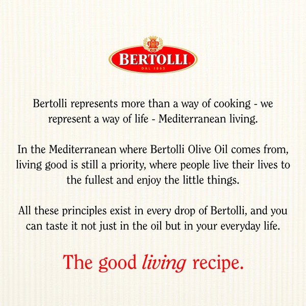 • The Good Living Recipe: As the world’s leading olive oil brand, Bertolli’s olive oil varieties are beloved by chefs and home cooks alike for their quality and versatility