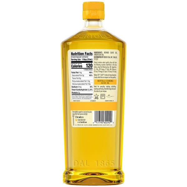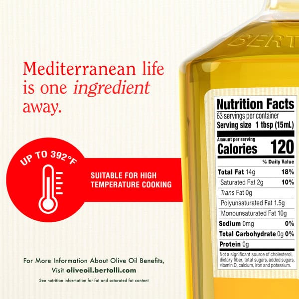 Bertolli Cooking Olive Oil embodies over 150 years of tradition. Crafted with care, each bottle brings Mediterranean flavors to your table, maintaining the highest quality from grove to plate. Designed for high temperature cooking with a smoke point of 392°F / 200°C, this olive oil is able to take the heat. Its mild flavor makes it perfect for deep frying, roasting, grilling, and baking, or for adding at the end of cooking to enhance flavor. This Bertolli olive oil is Non-GMO Project Verified and made from the highest quality olives. As the world’s #1 Olive Oil brand, Bertolli promises unparalleled excellence, inviting you to savor the richness of good Mediterranean living in every drop. The good living recipe.