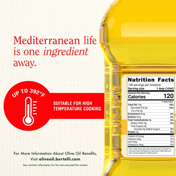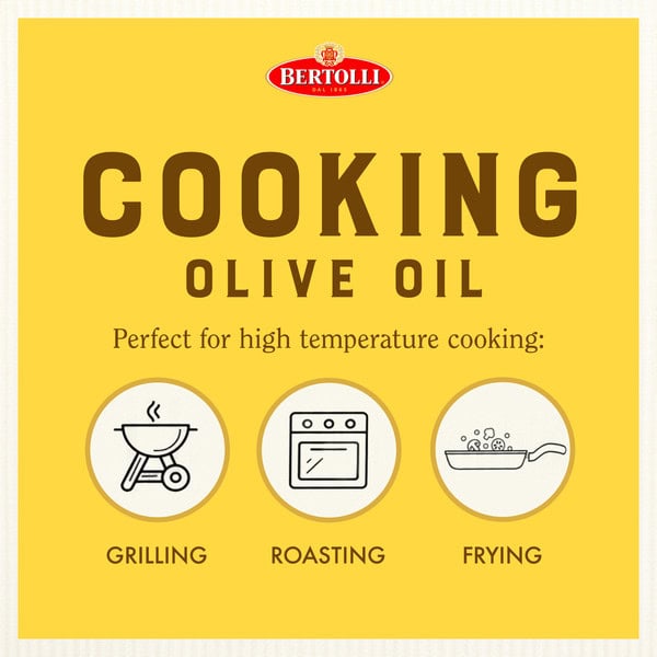 Bertolli Cooking Olive Oil embodies over 150 years of tradition. Crafted with care, each bottle brings Mediterranean flavors to your table, maintaining the highest quality from grove to plate. Designed for high temperature cooking with a smoke point of 392°F / 200°C, this olive oil is able to take the heat. Its mild flavor makes it perfect for deep frying, roasting, grilling, and baking, or for adding at the end of cooking to enhance flavor. This Bertolli olive oil is Non-GMO Project Verified and made from the highest quality olives. As the world’s #1 Olive Oil brand, Bertolli promises unparalleled excellence, inviting you to savor the richness of good Mediterranean living in every drop. The good living recipe.