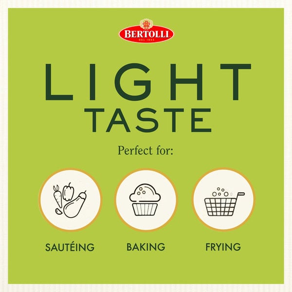 Bertolli Olive Oil Extra Light Taste embodies over 150 years of tradition in olive oil crafting. Carefully produced, each bottle brings the essence of the Mediterranean to your table, ensuring top quality from grove to plate. Designed for high-temperature cooking with a smoke point of 392°F / 200°C, this olive oil is perfect for cooking, able to withstand the heat without breaking down. Its mild flavor makes it an ideal choice for those who prefer a subtler taste, while still providing all the health benefits of olive oil. Perfect as a substitute for butter or other oils, it enhances any dish without overpowering flavors. Versatile for various culinary uses including salad dressing, sautĂ©ing, baking, and frying, our Non-GMO Project Verified Extra Light Taste olive oil offers a delicate touch. As the world’s leading olive oil brand, Bertolli invites you to experience the richness of Mediterranean living with every drop of our Extra Light Taste olive oil. The good living recipe.