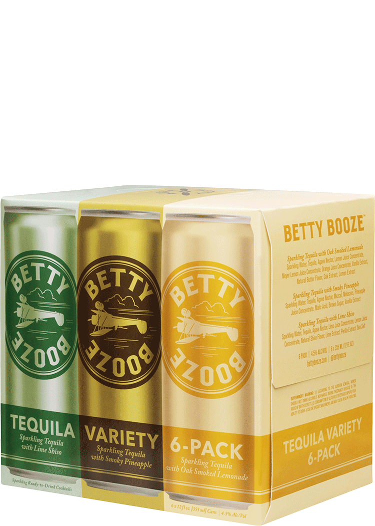 United States – New York – 4.5% – Betty Booze Sparkling Tequila Variety Pack features gourmet cocktails with homemade recipes by Blake Lively, including Oak Smoked Lemonade, Lime Shiso, and the NEW FLAVOR Smokey Pineapple.
