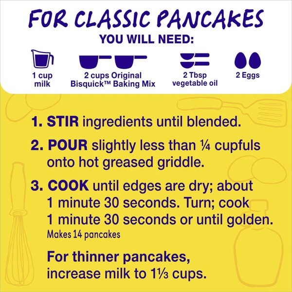 To Measure Bisquick Mix: Spoon into dry-ingredient measuring cup; level with knife. Do not sift. Classic Recipes: Classic Pancakes or Waffles: 2 cups Original Bisquick baking mix; 1 cup milk; 2 tablespoon vegetable oil; 2 eggs. 1. Stir ingredients until blended. Pancake Steps: Makes 14 pancakes. 2. Pour slightly less than 1/4 cupfuls onto hot greased griddle. 3.Cook until edges are dry; about 1 minute 30 seconds. Turn; cook 1 minute 30 seconds or until golden. Waffle Steps: makes 8 (4-inch) waffles. 2. Pour onto center of hot greased waffle maker; close lid. 3. Bake about 5 min or until steaming stops. Carefully remove waffle. For thinner pancakes, increase milk to 1 1/3 cups. High altitude (3500-6500 ft): No change. The Ultimate Pancake: just add the following Ingredients to step 1 of our classic pancakes recipe. 3 tablespoon sugar. 2 teaspoon baking powder. 1 teaspoon vanilla extract.