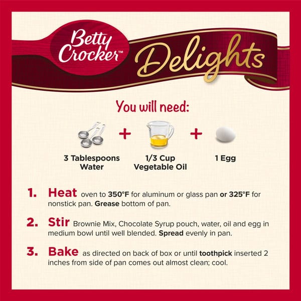 You Will Need: 3 tablespoons water + 1/3 cup vegetable oil + 1 egg (For cakelike brownies, use 3 tablespoons water, 1/3 cup vegetable oil and 2 eggs). 1. Heat oven to 350 degrees F for aluminum or glass pan or 325 degrees F for nonstick pan. Grease bottom of pan. 2. Stir Brownie Mix, Chocolate Syrup pouch, water, oil and egg in medium bowl until well blended. Spread evenly in pan. 3. Bake as directed below or until toothpick inserted 2 inches from side of pan comes out almost clean; cool. Pan Size: 8 inch x 8 inch; 35-35 bake time (in minutes). 9 inch x 9 inch; 28-31 bake time (in minutes). 11 inch x 7 inch; 26-29 bake time (in minutes). Betty’s Tip: To cut warm brownies easily, cut with plastic knife using short sawing motions. Store tightly covered. High altitude (3500-6500 ft): Decrease bake time for all pans by 5 minutes.