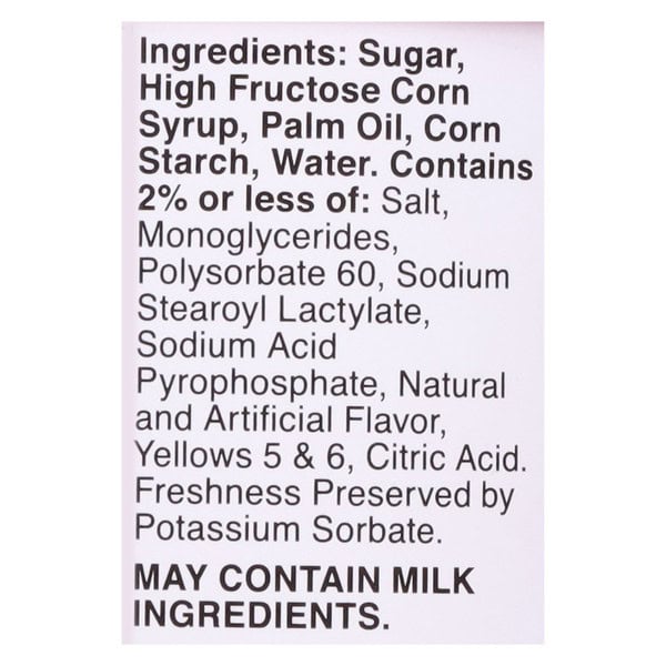Sugar, High Fructose Corn Syrup, Palm Oil, Corn Starch, Water, Contains 2% Or Less Of: Salt, Monoglycerides, Polysorbate 60, Sodium Stearoyl Lactylate, Sodium Acid Pyrophosphate, Natural And Artificial Flavor, Yellows 5 & 6, Citric Acid, Freshness Preserved By Potassium Sorbate