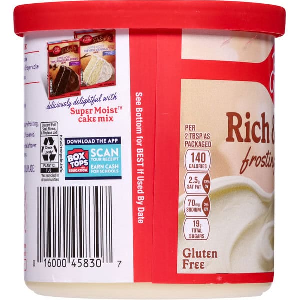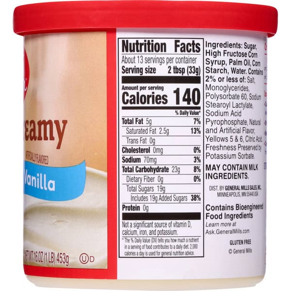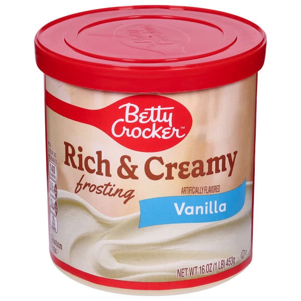 How will you enjoy the rich, decadent flavor of our creamy and delicious frosting? Betty Crocker Gluten Free Vanilla Frosting perfectly tops all your cakes, cupcakes and cookies for the whole family to enjoy. Just pop open the can, spread the frosting and share! You can level up your deserts with sprinkles or drizzles or enjoy the rich milk vanilla flavor plain. Instant gluten-free gratification!
