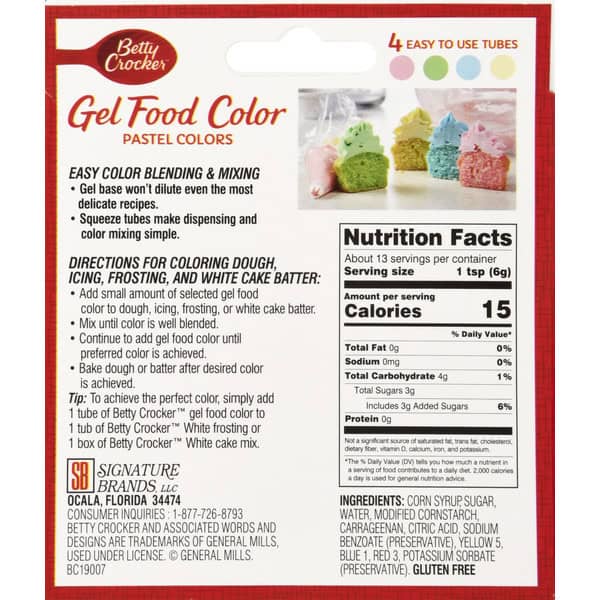 Gluten free. 4 easy to use tubes. Easy to Mix Color: 1 tube color + 1 tub frosting. 1 tub color + 1 box cake mix. Gel color won’t thin mixes or frostings. Easy color blending & mixing. Gel base won’t dilute even the most delicate recipes. Squeeze tubes make dispensing and color mixing simple. Consumer inquiries: 1-877-726-8793. Made in USA.