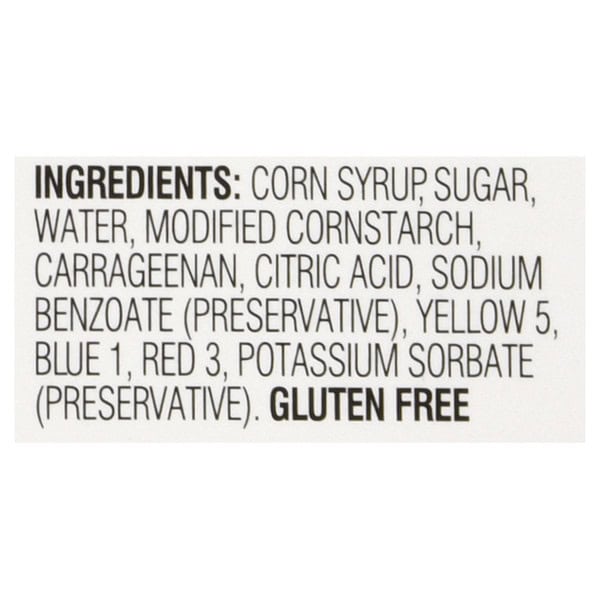 Corn Syrup, Sugar, Water, Modified Cornstarch, Carrageenan, Citric Acid, Sodium Benzoate (preservative), Yellow 5, Blue 1, Red 3, Potassium Sorbate (preservative)