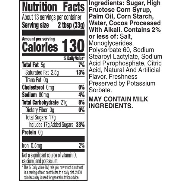 Sugar, High Fructose Corn Syrup, Palm Oil, Corn Starch, Water, Cocoa Processed With Alkali, Contains 2% Or Less Of: Salt, Monoglycerides, Polysorbate 60, Sodium Stearoyl Lactylate, Sodium Acid Pyrophosphate, Citric Acid, Natural And Artificial Flavor, Freshness Preserved By Potassium Sorbate