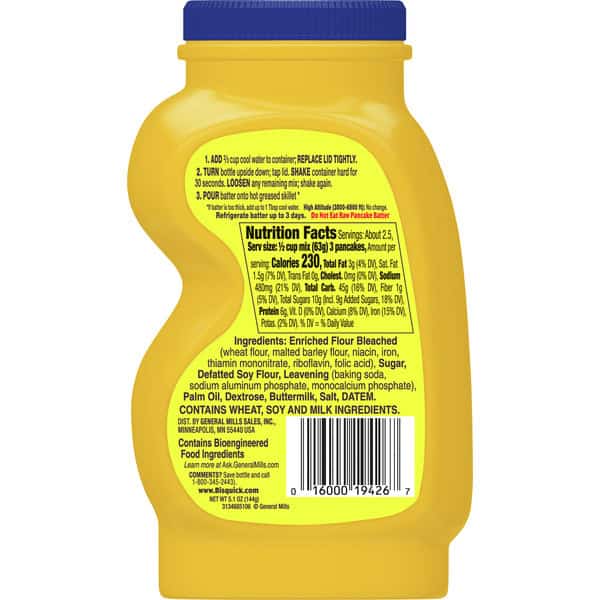 1. Add 2/3 cup cool water to container; replace lid tightly. 2. Turn bottle upside down; tap lid. Shake container hard for 30 seconds. Loosen any remaining mix; shake again. 3. Pour batter onto hot greased skillet*. High altitude (3500-6500 ft): no change. Refrigerate batter up to 3 days. *If batter is too thick, add up to 1 tbsp cool water. Do not eat raw pancake batter.