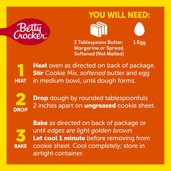 Makes 15 cookies you will need: 2 tablespoons butter, margarine or spread (Spread should have at least 60% vegetable oil) softened (To soften butter directly from refrigerator, microwave on high 10-15 seconds) (not melted) 1 egg. 1. Heat oven as directed below. Stir cookie mix, softened butter and egg in a medium bowl, until dough forms. 2. Drop dough by rounded tablespoonfuls 2 inches apart on an ungreased cookie sheet. 3. Bake as directed below or until edges are light golden brown. Let cool 1 minute before removing from cookie sheet. Cool completely; store in airtight container. Number of Cookies: 15-17 regular; Oven Temperature: 375 degrees F aluminum pan 350 degrees F for nonstick pan; Drop Dough by: Rounded tablespoon; Bake Time: 11 to 13 minutes, Number of Cookies: 8 large; Oven Temperature: 350 degrees F aluminum pan 325 degrees F nonstick pan; Drop Dough by: About 3 tablespoons; Bake Time: 17 to 19 minutes. High altitude (3500-6500 ft): No change. Do not eat raw cookie dough.