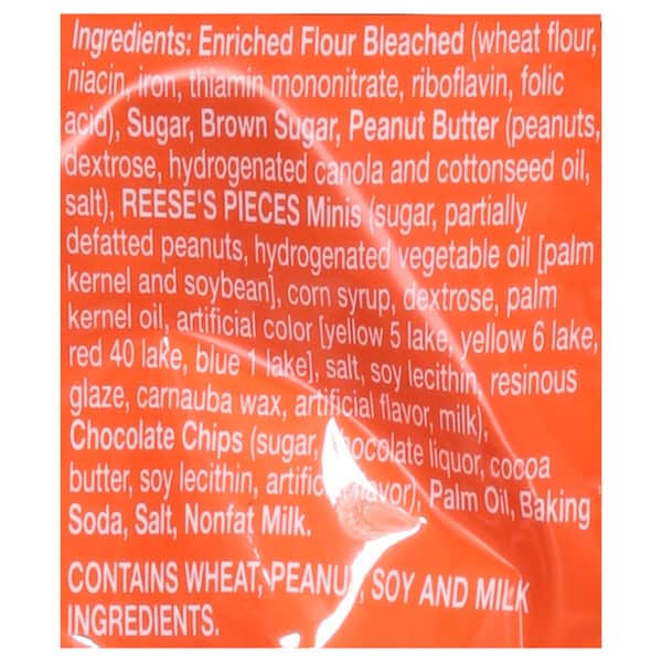 Enriched Flour Bleached (wheat Flour, Niacin, Iron, Thiamin Mononitrate, Riboflavin, Folic Acid), Sugar, Brown Sugar, Peanut Butter (peanuts, Dextrose, Hydrogenated Canola And Cottonseed Oil, Salt), Reese’s Pieces Minis (sugar, Partially Defatted Peanuts, Hydrogenated Vegetable Oil [palm Kernel And Soybean], Com Syrup, Dextrose, Palm Kernel Oil, Artificial Color [yellow 5 Lake, Yellow 6 Lake, Red 40 Lake, Blue 1 Lake], Salt, Soy Lecithin, Resinous Glaze, Carnauba Wax, Artificial Flavor, Milk), Chocolate Chips (sugar, Chocolate Liquor, Cocoa Butter, Soy Lecithin, Artificial Flavor), Palm Oil, Baking Soda, Salt, Nonfat Milk