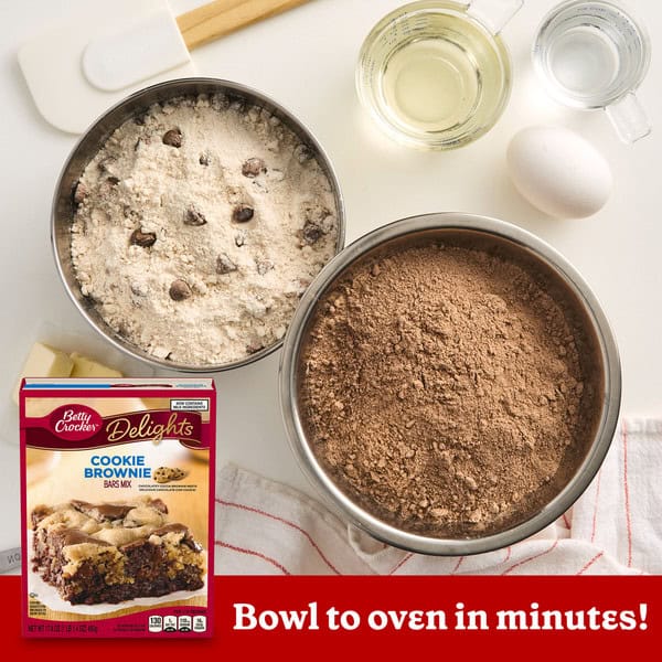 Satisfy your sweet tooth cravings with Betty Crocker Delights Cookie Brownie Bar Mix. This brownie mix, combined with cookie mix, is the quick and easy way to create a delicious treat the whole family will love by adding just a few ingredients. Bite into a decadent cookie bar mixed with chocolatey brownie in just a few simple steps.
