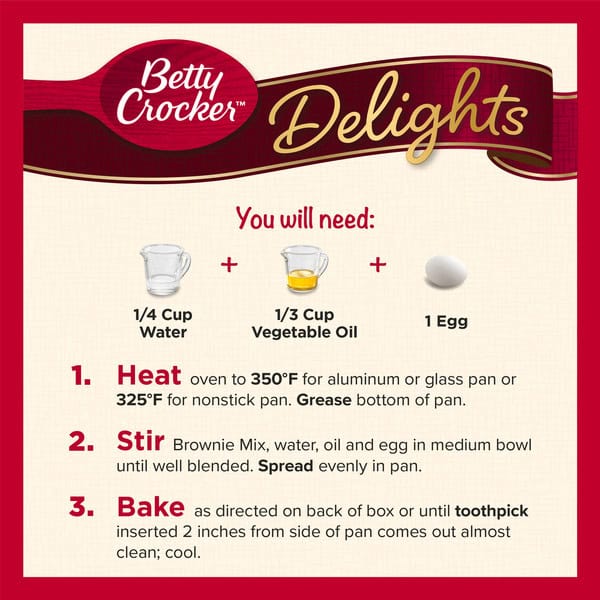 Preparation Instructions Text: You will need: 1/4 cup water + 1/3 cup vegetable oil + 1 egg (For cakelike brownies, use 1/4 cup water, 1/3 cup vegetable oil and 2 eggs). 1. Heat oven to 350 degrees F for shiny metal or glass pan or 325 degrees F for nonstick pan. Grease bottom of pan. 2. Stir brownie mix, water, oil and egg in medium bowl until well blended. Spread in pan. 3. Bake as directed below or until toothpick inserted 2 inches from side of pan comes out almost clean; cool. Pan Size (8 inches x 8 inches): 35-38 bake time (in minutes). Pan Size (9 inches x 9 inches): 30-33 bake time (in minutes). Pan Size (11 inches x 7 inches): 28-31 bake time (in minutes). Betty’s Tip: To cut warm brownies easily, cut with plastic knife using short sawing motions. Store tightly covered. High Altitude (3500-6500 ft): No change.