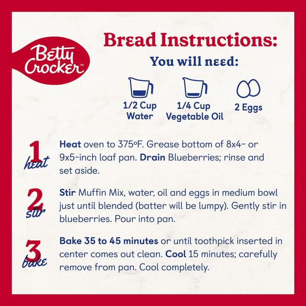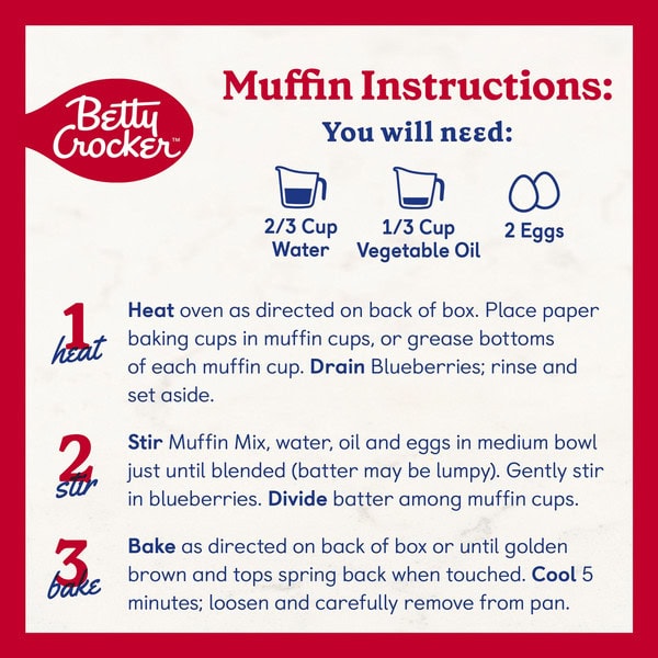 Fresh, fluffy blueberry muffins have never been easier. Just add water, oil and eggs, bake and enjoy! With Betty Crocker Wild Blueberry Muffin & Bread Mix, a home-baked blueberry sensation is just minutes away. Use the baking mix as is for an easy breakfast or snack or explore Betty Crocker recipes for a new take on this classic treat to fill your home with the delicious scent of blueberry muffins.