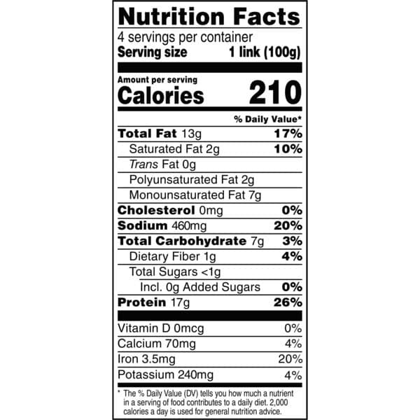 Water, Yellow Pea Protein*, Avocado Oil, Brown Rice Protein, Natural Flavors, Methylcellulose, 2% or less of Inulin, Oat Bran, Sunflower Lecithin, Vinegar, Yeast Extract, Oat Fiber, Lemon Juice Concentrate, Rice Starch, Vegetable Juice Color, Pea Starch, Salt, Spices, Apple Extract, Potato Starch, Calcium Chloride, Citric Acid, Potassium Salt, Pomegranate Concentrate, Onion Powder, Paprika Extract; Sodium Alginate Casing.