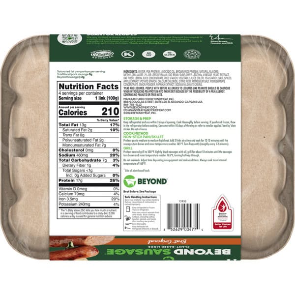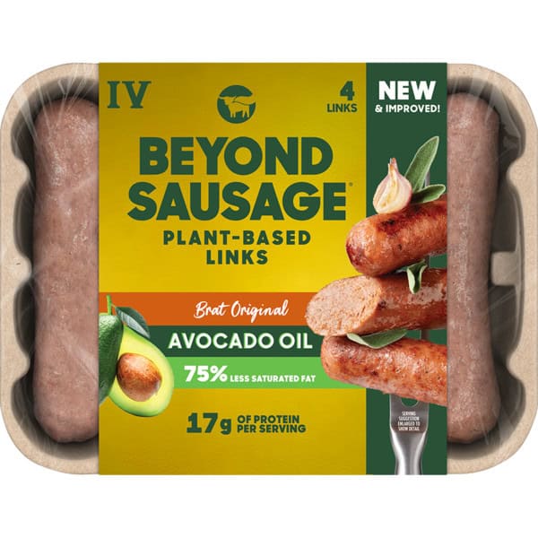 From grill to frying pan, our Beyond Sausage® Brat Original is our meatiest, juiciest, most flavorful plant-based sausage yet, now made with avocado oil. With 17g of protein per serving and 75% less saturated fat than traditional pork sausage, these hearty links offer a cleaner option for everyone. Made from simple plant-based ingredients – like yellow peas and brown rice – our Beyond Sausage has no GMOs, no soy and no gluten. Each pack contains 4 plant-based links that can be thrown in a bun, put on kebabs, sliced onto pizza or crumbled into sauce. Bigger flavor in every bite.