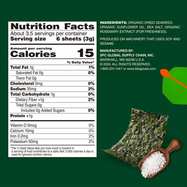 Satisfy your craving for something crispy, savory and delicious with bibigo Sea Salt Flavored Seaweed Snacks. These light and crunchy seaweed snacks are seasoned with hints of sea salt, offering a savory taste bursting with bibi-good flavor. Swift and convenient, these snacks are perfect for on-the-go. Enjoy it as a quick snack or alongside your favorite Korean dishes. Just keep a pack close by to make life more delicious.