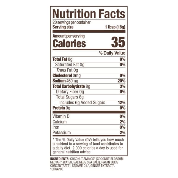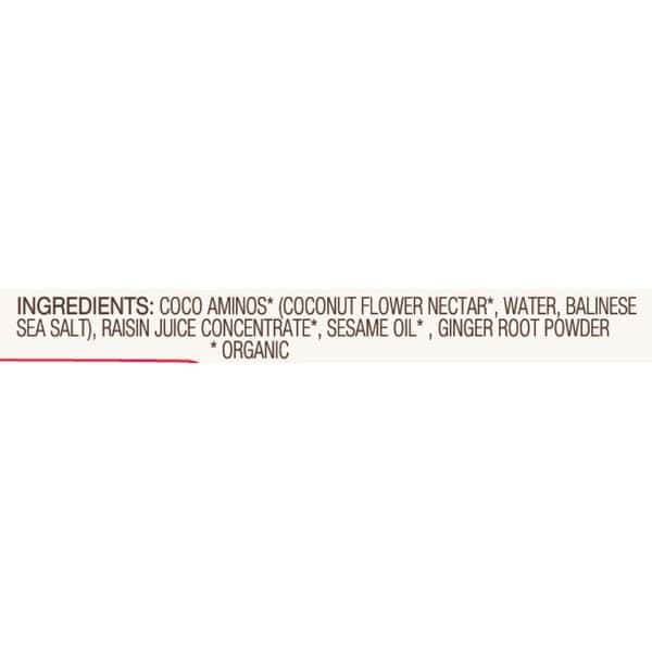 Coco Aminos* (Coconut Blossom Nectar*, Water, Balinese Sea Salt), Raisin Juice Concentrate*, Sesame Oil*, Ginger Extract*. *Organic