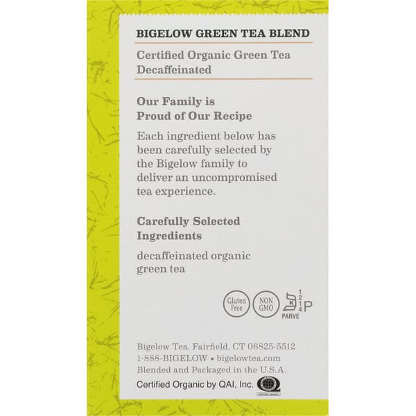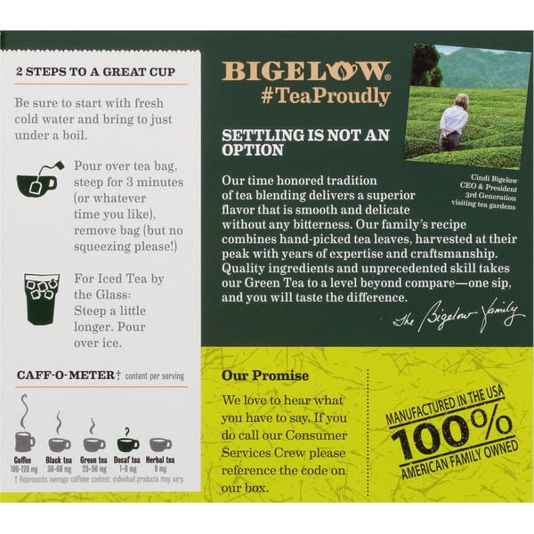 America’s classic. Family tea blenders since 1945. 4 tea bags in each foil pouch. Our organic green blend enlivens the earthy flavors of this delicate tea. Protected in foil because flavor matters. Our family selects ingredients so carefully that they must protect them in foil to allow you to experience their full flavor, freshness, aroma. Caff-O-Meter (Represents average caffeine content: Individual products may vary) content per serving: Coffee: 100-120 mg; Black Tea: 30-60 mg; Green Tea: 25-50 mg; Decaf Tea: 1-8 mg; Herbal Tea: 0 mg. Settling is not an option. Our time honored tradition of tea blending delivers a superior flavor that is smooth and delicate without any bitterness. Our family’s recipe combines hand-picked tea leaves, harvested at their peak with years of expertise and craftmanship. Quality ingredients and unprecedented skill takes our Green Tea to a level beyond compare – one sip, and you will taste the difference – The Bigelow Family. Our family is proud of our recipe. Each ingredient below has been carefully selected by the Bigelow family to deliver an uncompromised tea experience. Carefully selected ingredients. Zero-landfill company. Our folding cartons are recyclable. Certified B Corporation. Ethical Tea Partnership.