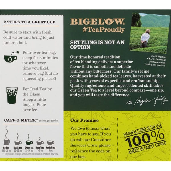 America’s classic. Family tea blenders since 1945. 4 tea bags in each foil pouch. Our organic green blend enlivens the earthy flavors of this delicate tea. Protected in foil because flavor matters. Our family selects ingredients so carefully that they must protect them in foil to allow you to experience their full flavor, freshness, aroma. Caff-O-Meter (Represents average caffeine content: Individual products may vary) content per serving: Coffee: 100-120 mg; Black Tea: 30-60 mg; Green Tea: 25-50 mg; Decaf Tea: 1-8 mg; Herbal Tea: 0 mg. Settling is not an option. Our time honored tradition of tea blending delivers a superior flavor that is smooth and delicate without any bitterness. Our family’s recipe combines hand-picked tea leaves, harvested at their peak with years of expertise and craftmanship. Quality ingredients and unprecedented skill takes our Green Tea to a level beyond compare – one sip, and you will taste the difference – The Bigelow Family. Cindi Bigelow CEO & President 3rd generation visiting tea gardens. Our family is proud of our recipe. Each ingredient below has been carefully selected by the Bigelow family to deliver an uncompromised tea experience. Carefully selected ingredients. Zero-landfill company. Our folding cartons are recyclable. Certified B Corporation. Ethical Tea Partnership.