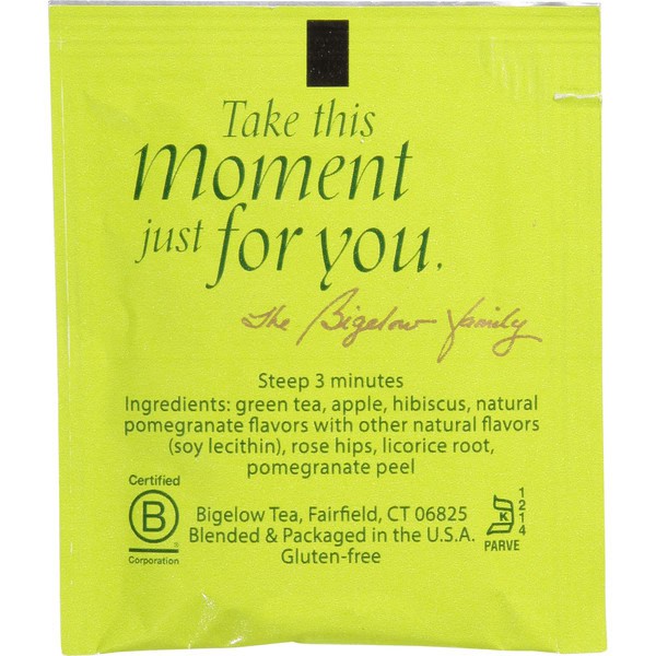Green Tea, Apple, Hibiscus, Natural Pomegranate Flavors With Other Natural Flavors (soy Lecithin), Rose Hips, Licorice Root, Pomegranate Peel