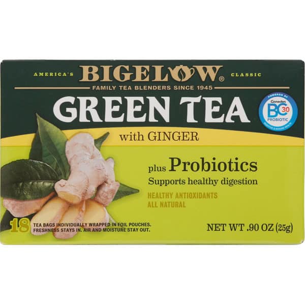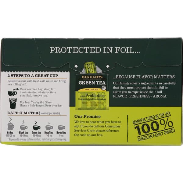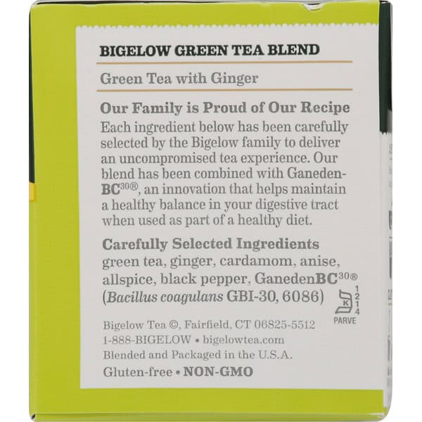 America’s classic. Family tea blenders since 1945. Powered by Ganeden BC 30 Probiotic. Plus probiotics. Supports healthy digestion. Healthy antioxidants. All natural. Protected in foil – because flavor matters. Our family selects ingredients so carefully that they must protect them in foil to allow you to experience their full: flavor; freshness; aroma. Bigelow Green Tea Blend: Green Tea with Ginger: Our Family is Proud of Our Recipe: Each ingredient below has been carefully selected by the Bigelow family to deliver an uncompromised tea experience. Our blend has been combined with Ganeden- BC30, an innovation that helps maintain a healthy balance in your digestive tract when used as part of a healthy diet. Proud to be: Zero-Landfill Company. Ethical Tea Partnership. It’s easy being green Here at Bigelow Tea, our commitment to the environment is a top priority! Each of our facilities has a dedicated Green” team focused on identifying ways to become more environmentally sensitive, from installing solar panels at our headquarters to enforcing company-wide composting & recycling programs. We were thrilled when our three manufacturing facilities achieved “zero waste to landfill” status. We are also extremely proud of the fact that, in 2003. we purchased the Charleston Tea Plantation in Wadmalaw Island. South Carolina. We were able to preserve 127 acres of beautiful tea bushes. The tea produced from these bushes is used exclusively for a special line of Charleston Tea Plantation teas. Today the farm is thriving and has over 60,000 visitors a year. At Bigelow we are 100% committed to protecting the environment now, and for generations to come! – The Bigelow Family.